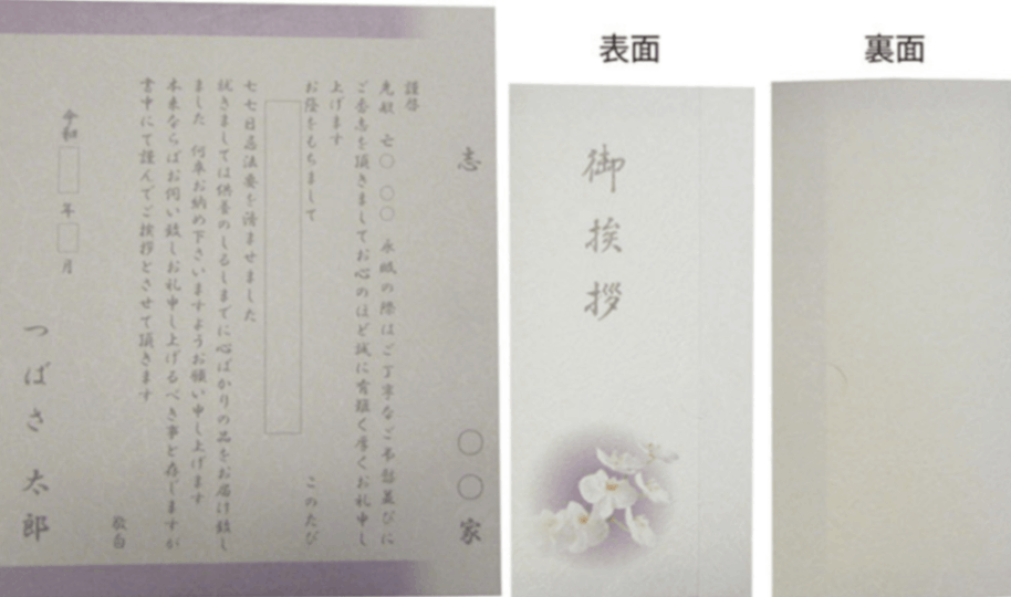 ※専用挨拶状をサービスにてご用意しております。 挨拶状は大切なお名前・戒名などが入りますので専任スタッフまでに電話または、メールにてお問合せください。