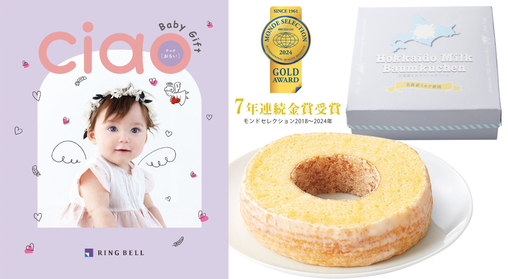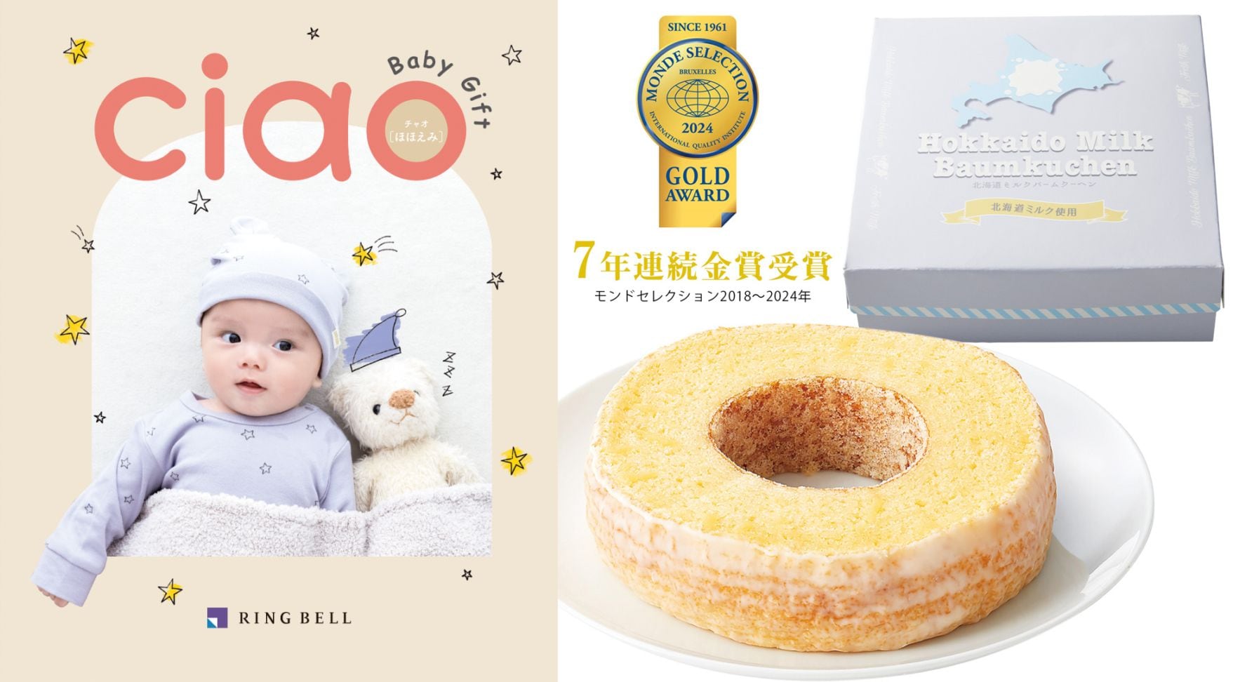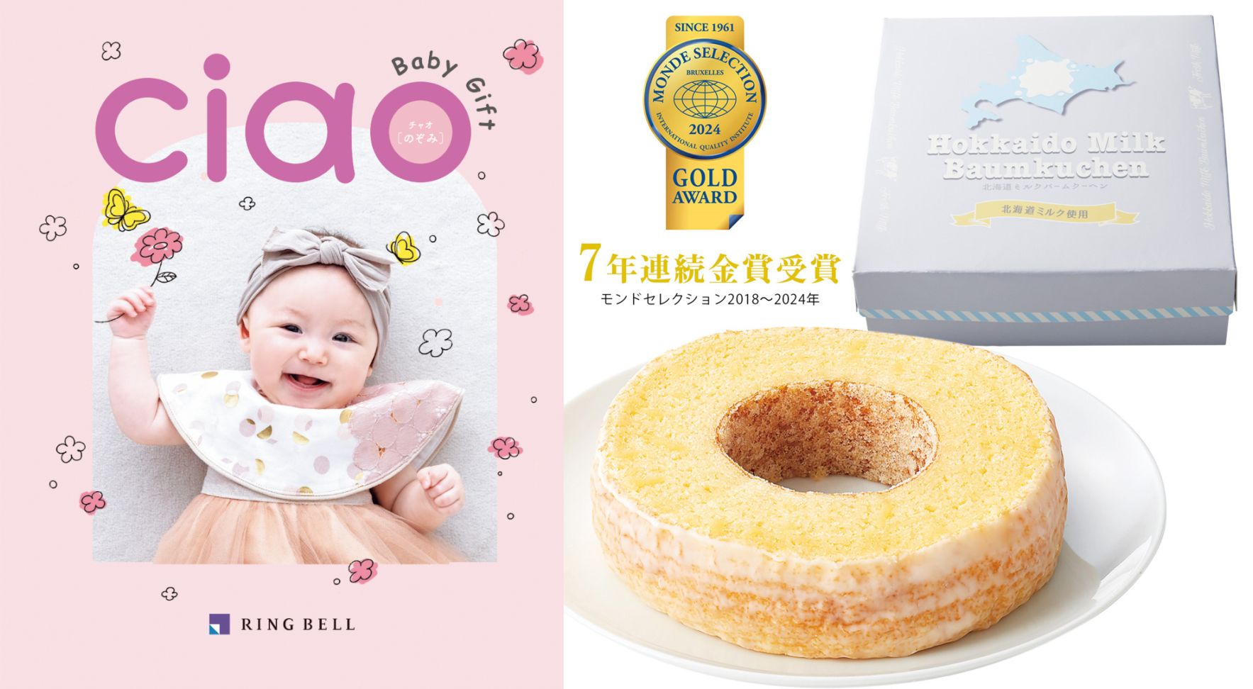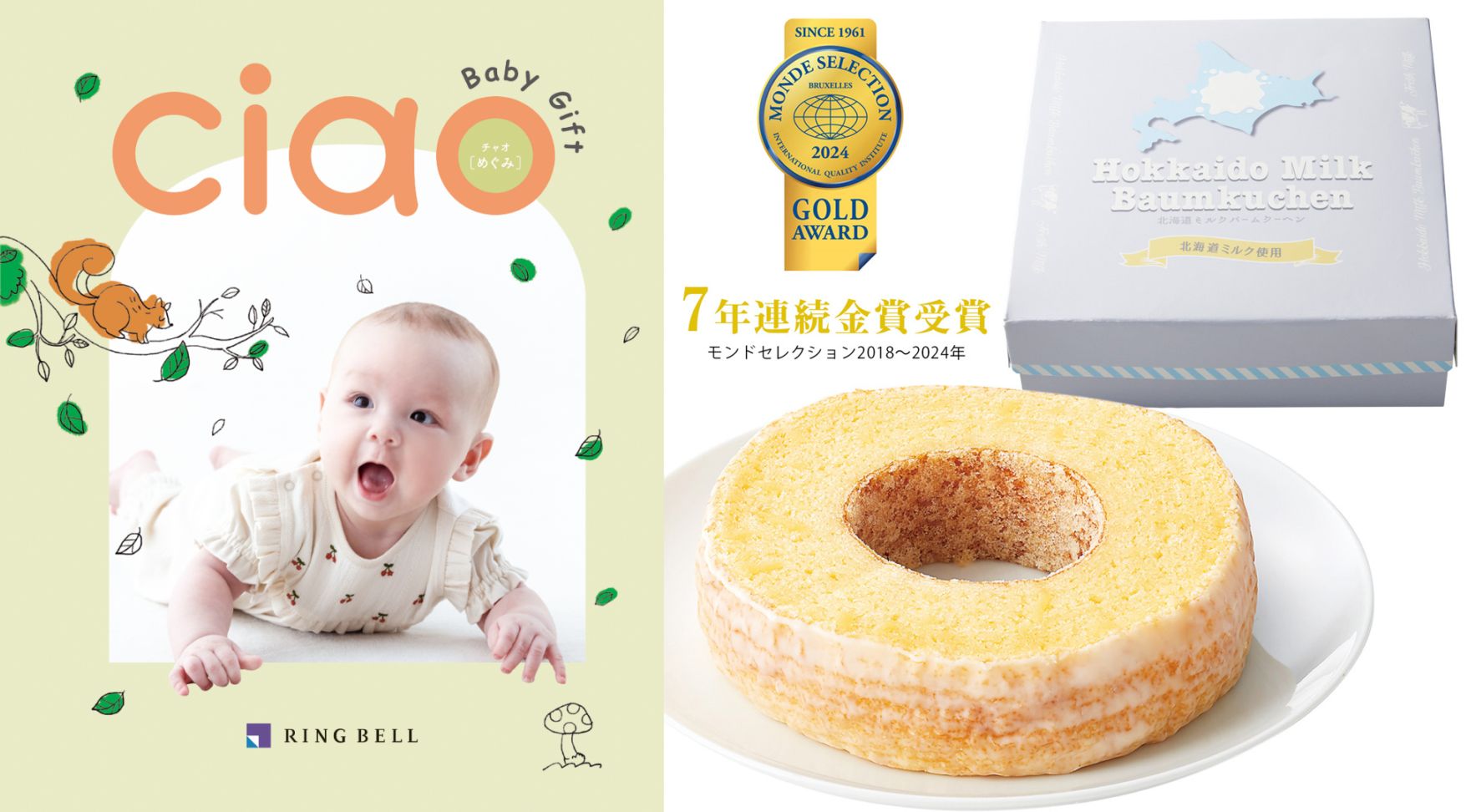 【出産内祝い専用カタログギフトのバウムクーヘンセット】チャオ(ほほえみ)+北海道ミルク しっとりバーム☆モンドセレクション(2018~2025年)7年連続金賞受賞