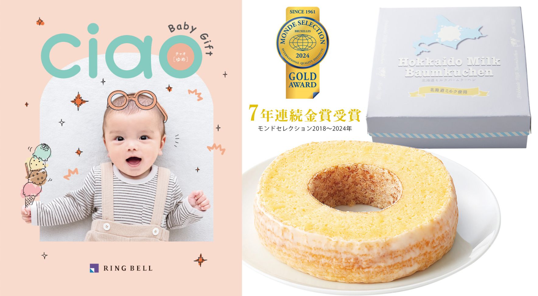 【出産内祝い専用カタログギフトのバウムクーヘンセット】チャオ(ゆめ)+北海道ミルク しっとりバーム☆モンドセレクション(2018~2025年)7年連続金賞受賞