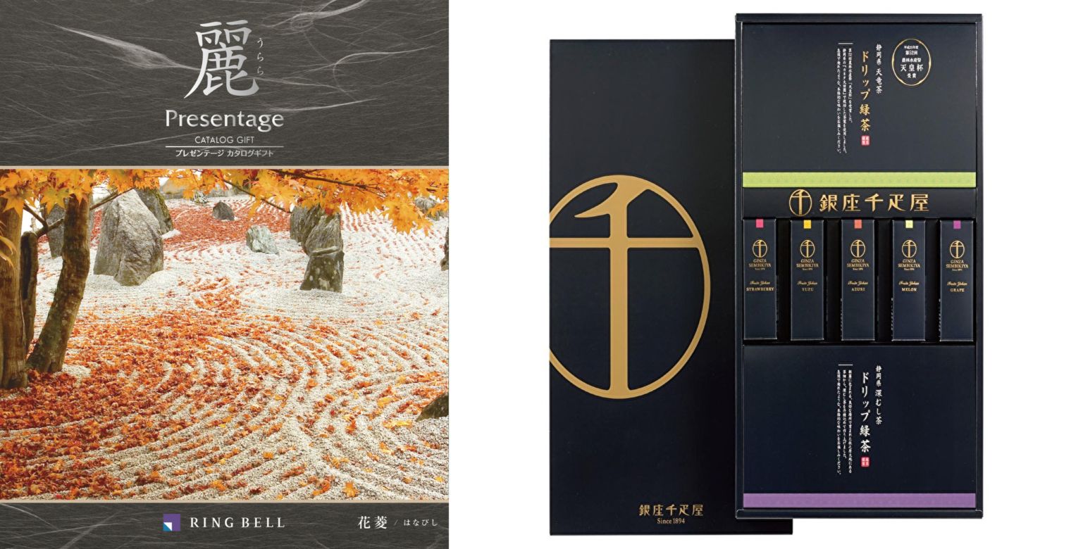 【お香典返し専用のおすすめ推奨定番品】カタログギフト 麗 花菱(はなびし)+銀座千疋屋 銀座フルーツ羊羹&緑茶セット(天皇杯・農林水産大臣賞受賞)