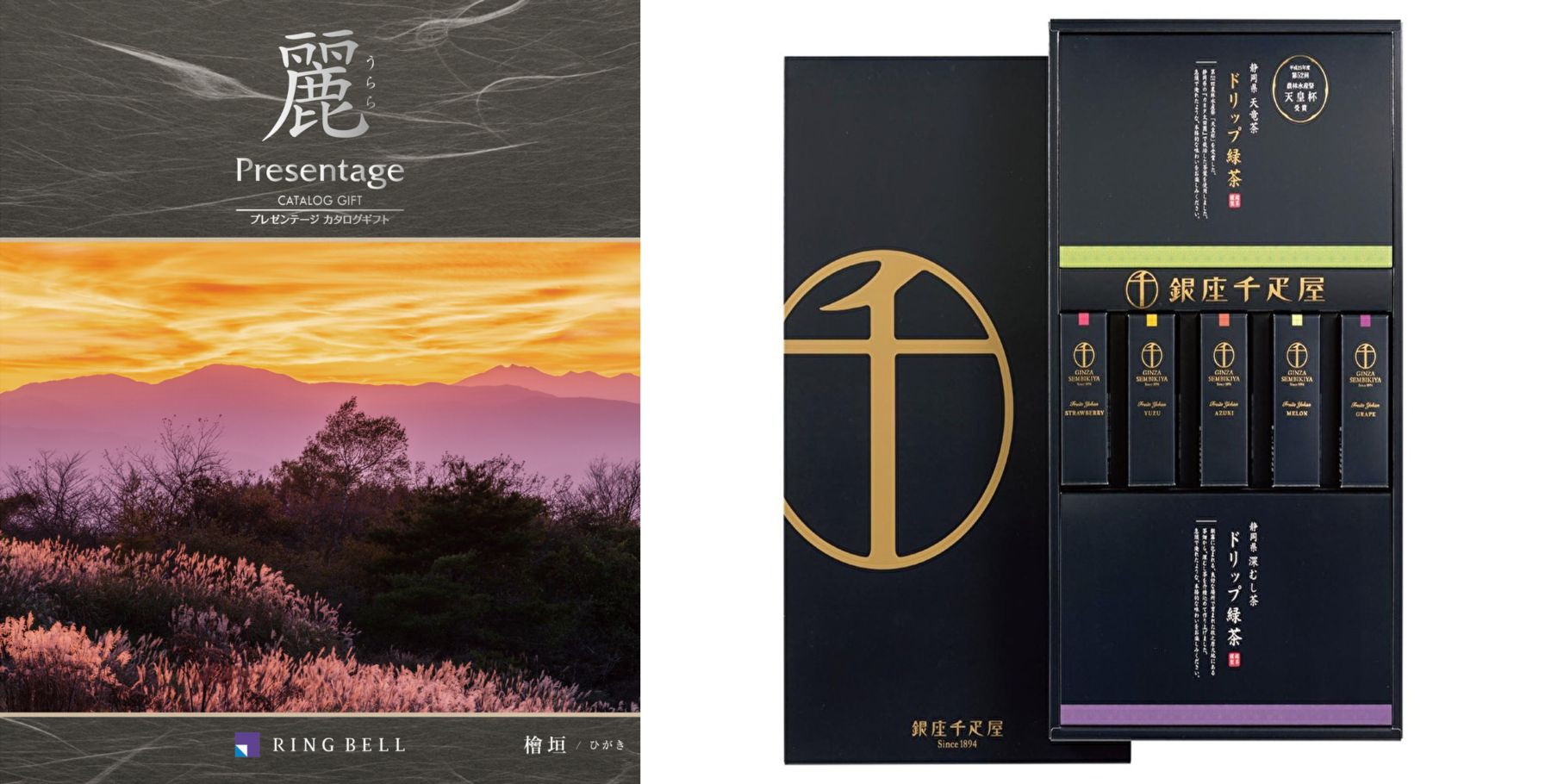 【お香典返し専用のおすすめ推奨定番品】カタログギフト 麗 檜垣(ひがき)+銀座千疋屋 銀座フルーツ羊羹&緑茶セット(天皇杯・農林水産大臣賞受賞)