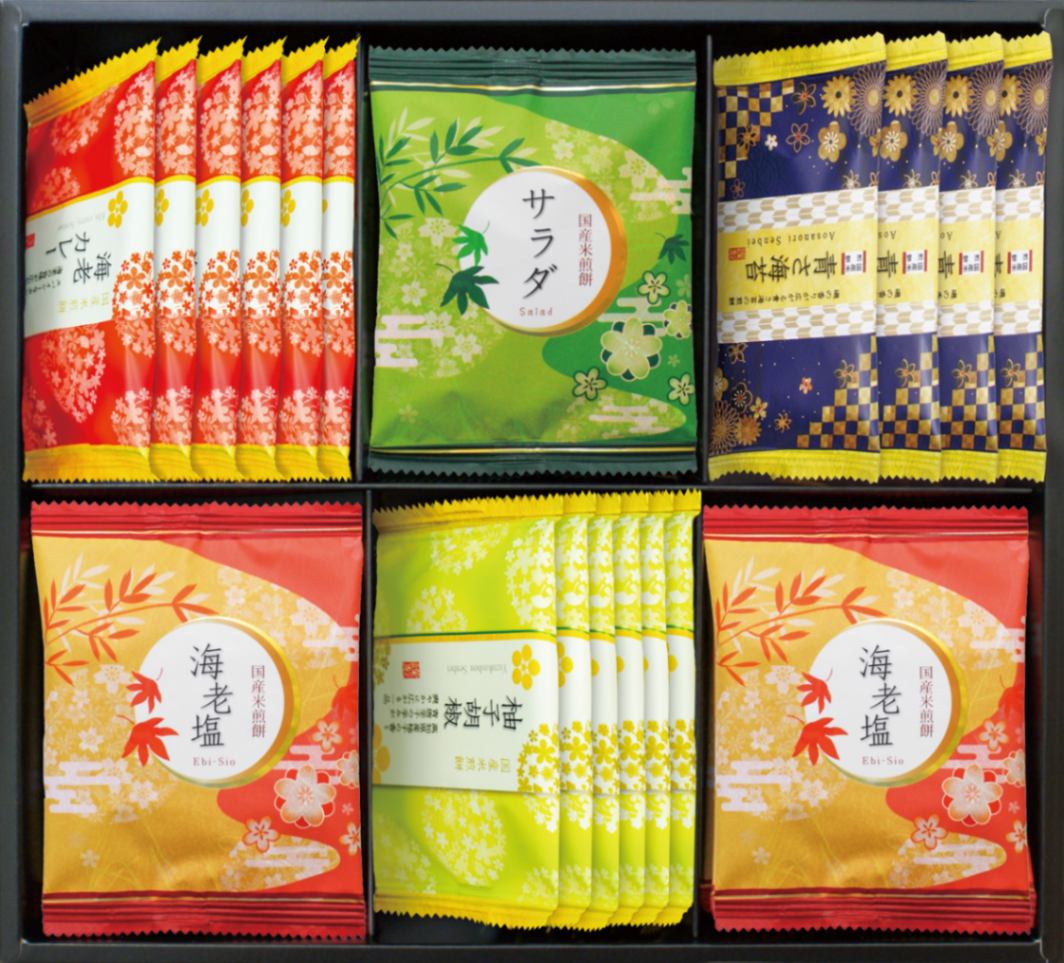●内容量:黒豆おかき×12青さ海苔煎餅×12、のり巻きあられ×8、柚子胡椒煎餅×8、海老カレー煎餅×8、海老塩煎餅×4、サラダ煎餅×4
