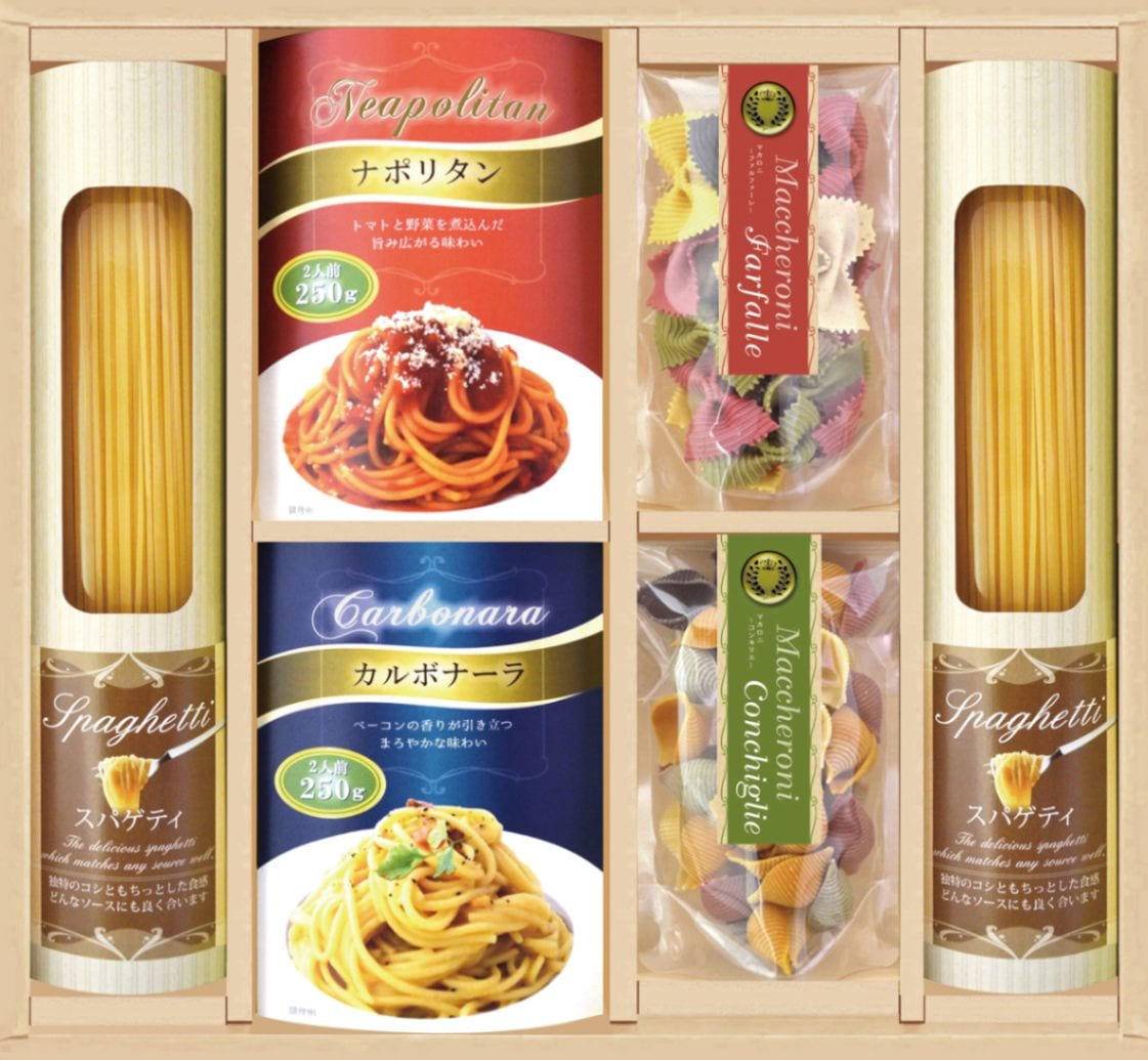 ●内容:スパゲティ130g×3、パスタソース250g(ナポリタン2人前・ミートソース2人前)×各1、自然色パスタ(コンキリエ60g・ファルファー¥4,860(税込)